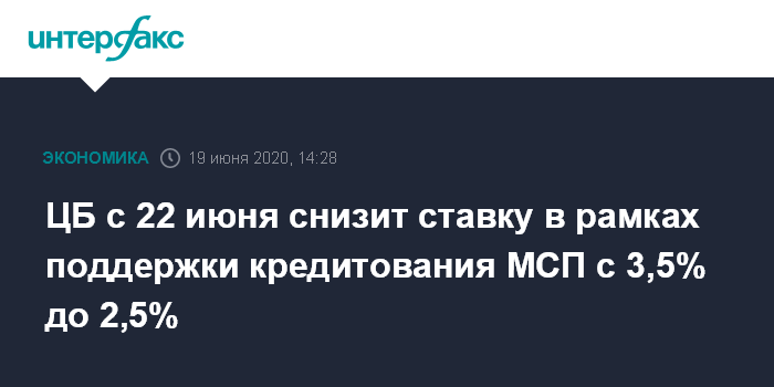Москва. 19 июня. INTERFAX.RU - Банк России принял решение о снижении с 22 июня процентной ставки по кредитам, направленным на поддержку кредитования малого и среднего предпринимательства (МСП), а также кредитования на неотложные нужды для поддержки и сохранения занятости, с 3,5% до 2,5% годовых, говорится в сообщении регулятора.