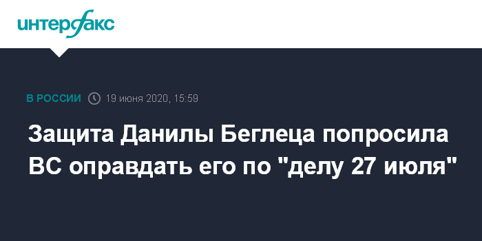 Москва. 19 июня. INTERFAX.RU - Защита Данилы Беглеца обжаловала в Верховном суде обвинительный приговор по "делу 27 июля", сообщил адвокат Леонид Соловьев. Беглец стал первым фигурантом этого дела, дошедшим до ВС.