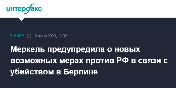Москва. 19 июня. INTERFAX.RU - Германия оставляет за собой право на новые меры в отношении РФ в связи с убийством в Тиргартене, заявила немецкий канцлер Ангела Меркель.