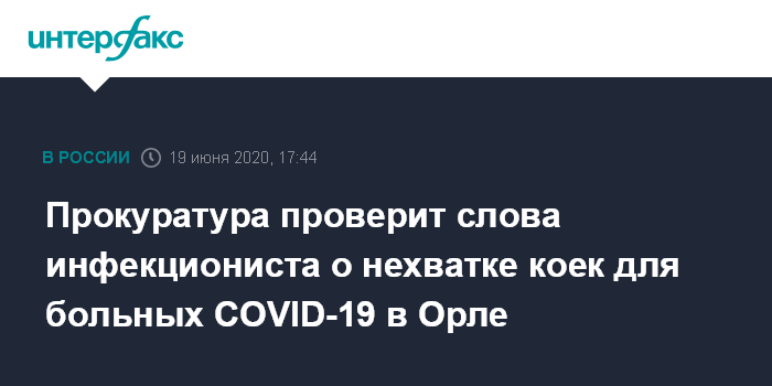 Москва. 19 июня. INTERFAX.RU - Прокуратура организовала проверку информации главного внештатного инфекциониста Орловской области Виктории Адоньевой, в интервью местному изданию заявившей об отсутствии коек для больных COVID-19.