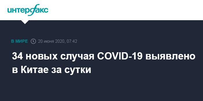 Москва. 20 июня. INTERFAX.RU - За истекшие сутки в Китае выявлены 34 новых случая заражения коронавирусом, из них 27 больных в активной форме и семь бессимптомных носителей, сообщил Госкомздрав КНР на своем официальном сайте.