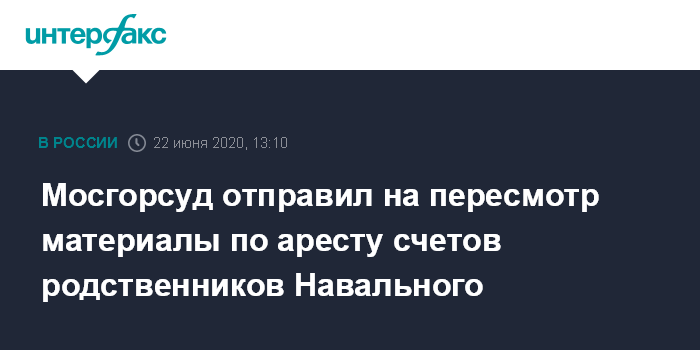 Москва. 22 июня. INTERFAX.RU - Мосгорсуд отменил и отправил на пересмотр вопрос об аресте банковских счетов родственников политика Алексея Навального и главы Фонда борьбы с коррупцией Ивана Жданова в рамках уголовного дела об отмывании денежных средств.