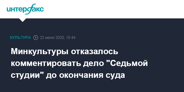 Москва. 22 июня. INTERFAX.RU - Министерство культуры отказалось давать комментарии по делу "Седьмой студии", пока не завершен суд, заявили в пресс-службе ведомства. Там напомнили, что министерство является потерпевшей стороной в этом уголовном деле.