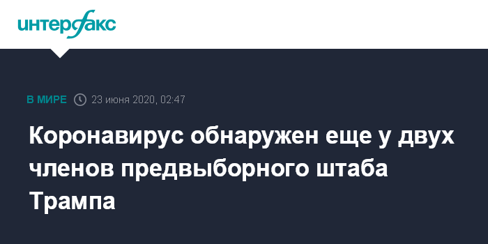 Ранее сообщалось, что перед состоявшимся в субботу митингом Трампа в Талсе COVID-19 был обнаружен у шести сотрудников его предвыборного штаба. Таким образом общее число сотрудников кампании, получивших положительный результат на коронавирус, достигло восьми человек.