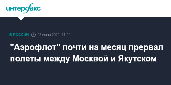 Москва. 23 июня. INTERFAX.RU - "Аэрофлот" приостановил полеты между Москвы и Якутском более чем на три недели, уведомление об отмене рейсов авиакомпания разослала своим клиентам.