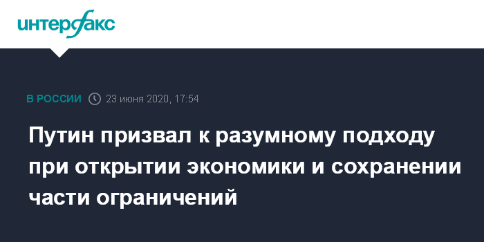 Москва. 23 июня. INTERFAX.RU - Президент России Владимир Путин заявил, что при открытии экономики и снятии ограничений, часть из которых вынуждено сохраняются, нужен разумный подход.