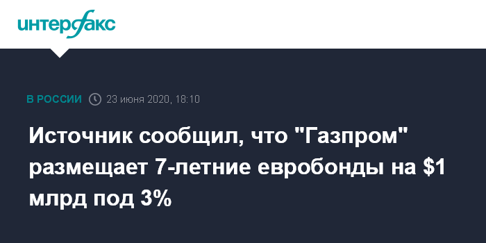 Источник сообщил, что "Газпром" размещает 7-летние евробонды на $1 млрд под 3%