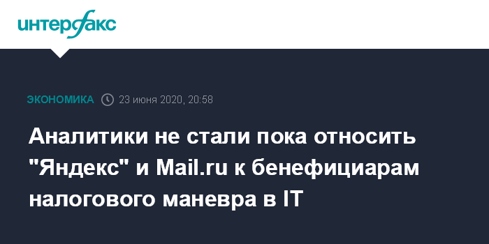 Москва. 23 июня. INTERFAX.RU - Аналитики "ВТБ Капитала" считают преждевременным относить "Яндекс" и Mail.ru Group к списку компаний, которые получат сниженные ставки по налогам в рамках господдержки IT-отрасли, из-за отсутствия четких критериев для попадания в список для налогового маневра.