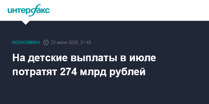 Москва. 23 июня. INTERFAX.RU - На выплаты, обещанные президентом РФ на детей в июле, будет потрачено 274 млрд рублей, сообщает пресс-служба Минтруда.