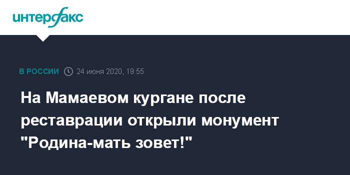 Москва. 24 июня. INTERFAX.RU - Монумент "Родина-мать зовет!" торжественно открыт в Волгограде после трех лет реставрации в день парада Победы, сообщила журналистам министр культуры РФ Ольга Любимова в среду.