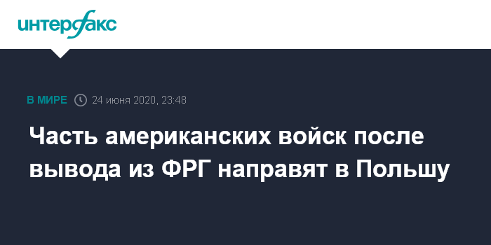 Москва. 24 июня. INTERFAX.RU - Часть американского воинского контингента, которая будет выведена из ФРГ, вернется на родину, часть - будет направлена в Польшу и другие европейские страны, заявил в среду президент США Дональд Трамп.