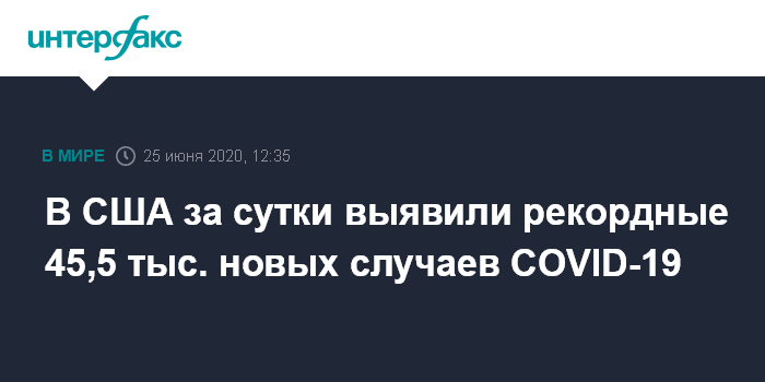 Москва. 25 июня. INTERFAX.RU - В Соединенных Штатах выявили рекордно высокое число новых заражений коронавирусом, передает в четверг CNBC, речь идет о более чем 45,5 тыс. новых случаев за сутки.