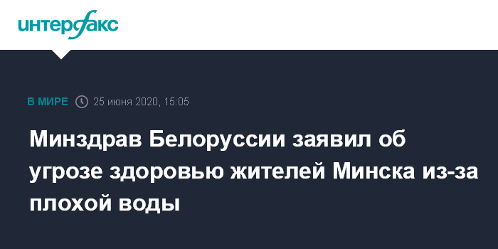 Москва. 25 июня. INTERFAX.RU - Минздрав Белоруссии направил письмо в администрации Фрунзенского и Московского районов Минска с указанием на опасность употребления водопроводной воды. Текст письма, датированного 24 июня, распространили пользователи социальных сетей.