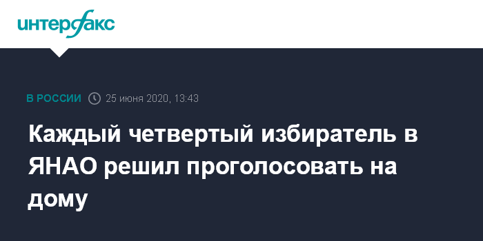 Москва. 25 июня. INTERFAX.RU - В Ямало-Ненецком автономном округе около 90 000 избирателей подали заявления в избиркомы на надомное голосование по поправкам в Конституцию, сообщила член избиркома ЯНАО с правом решающего голоса Светлана Клементьева. Всего ЯНАО около 360 000 избирателей.