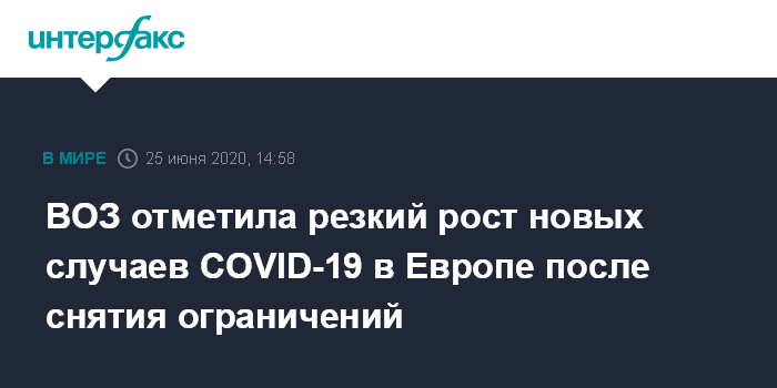 Москва. 25 июня. INTERFAX.RU - Во Всемирной организации здравоохранения (ВОЗ) в четверг заявили, что в Европе начало расти число новых случаев заболевания коронавирусом.