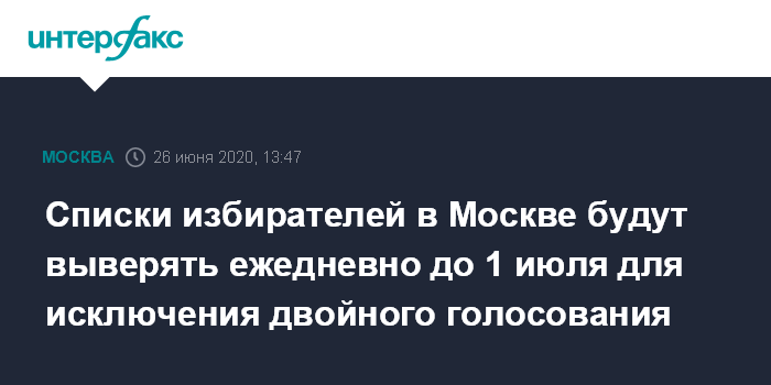 Москва. 26 июня. INTERFAX.RU - В Москве в ежедневном режиме до 1 июля - основного дня голосования по вопросу поправок в Конституцию РФ - будут проводиться выверки списков избирателей, в том числе записавшихся на электронного голосование, для исключения возможности проголосовать повторно, сообщил мэр Москвы Сергей Собянин.