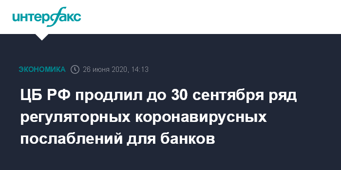 ЦБ РФ продлил до 30 сентября ряд регуляторных коронавирусных послаблений для банков