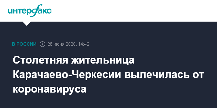 Москва. 26 июня. INTERFAX.RU - Одна из самых возрастных жительниц Карачаево-Черкесии - 100-летняя Муслимат Аджиева - вылечилась от коронавируса и выписана из больницы в республике, сообщили "Интерфаксу" в оперштабе КЧР.