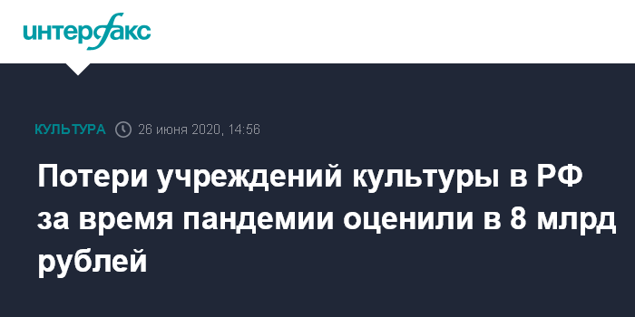 Москва. 26 июня. INTERFAX.RU - Потери учреждений культуры РФ во время пандемии коронавируса составили порядка 8 млрд рублей, сообщил во время итоговой коллегии Минкультуры РФ вице-премьер Дмитрий Чернышенко.