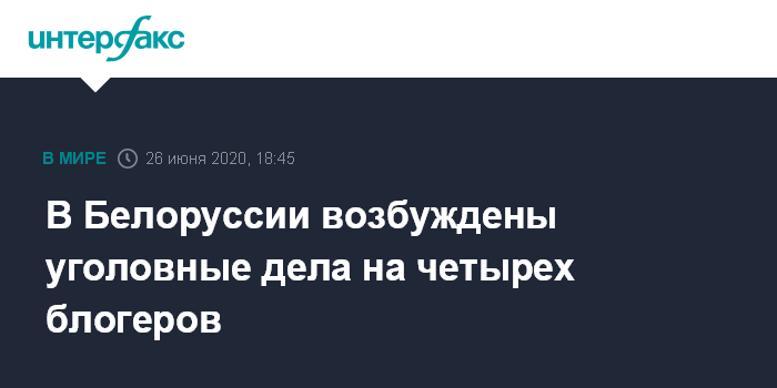 Москва. 26 июня. INTERFAX.RU - В Белоруссии возбуждены четыре уголовных дел на блогеров, сообщил правозащитный центр "Весна". Им вменяют статьи об организации нарушений общественного порядка либо об оскорблении представителя власти.