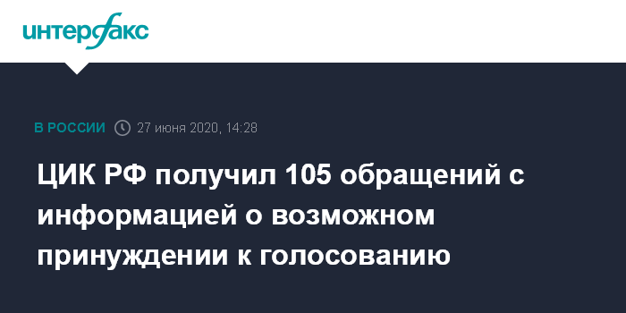 Москва. 27 июня. INTERFAX.RU - ЦИК России получил более ста обращений о принуждении к голосованию, сообщила глава комиссии Элла Памфилова в информцентре в субботу.