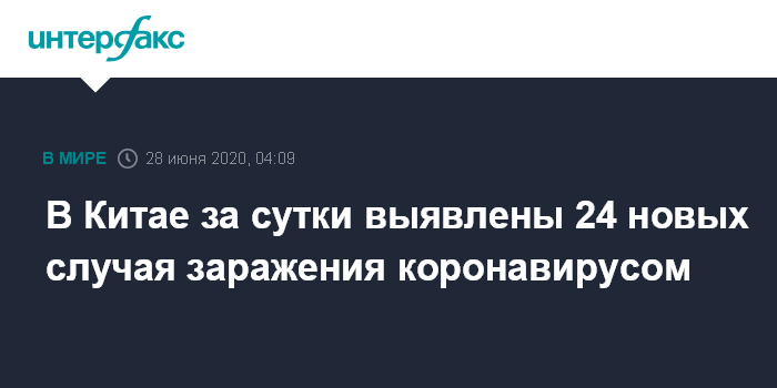 Москва. 28 июня. INTERFAX.RU - За истекшие сутки в Китае выявлены 24 новых случая заражения коронавирусом, из них 17 больных в активной форме и семь бессимптомных носителей, сообщил Госкомздрав КНР на своем официальном сайте.