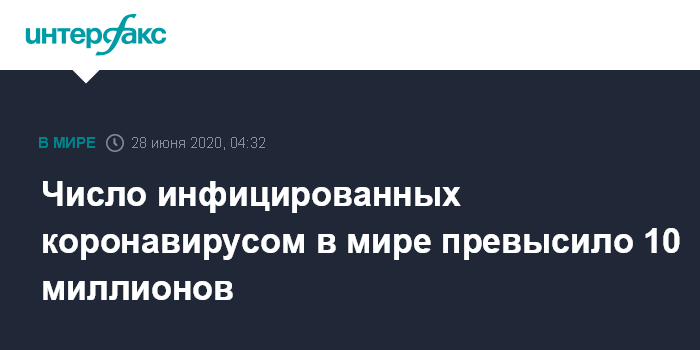 Москва. 28 июня. INTERFAX.RU - В мире с начала пандемии коронавируса зафиксировано 10 080 224 инфицированных, число умерших достигло 501 262 человек, сообщил портал Worldometer в ночь на воскресенье.