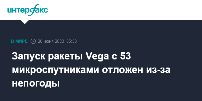 Москва. 28 июня. INTERFAX.RU - В связи с неблагоприятными погодными условиями отменен планировавшийся в воскресенье запуск легкой ракеты Vega Европейского космического агентства с 53 коммерческими микроспутниками, сообщила французская компания-оператор Arianespace.