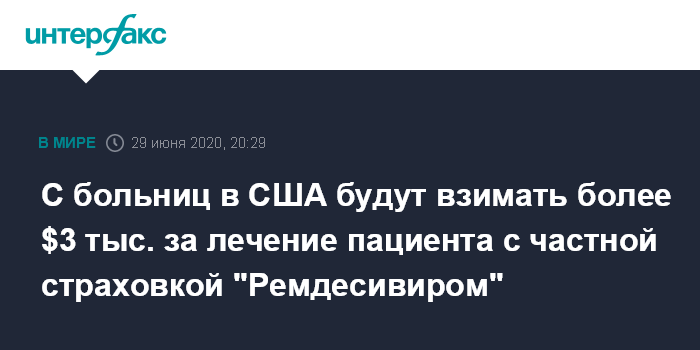В среднем препарат должен сократить расходы больниц на $12 тыс. на пациента, сказал он. Расчеты компании основаны на данных, согласно которым один день пребывания пациента в больнице стоит $3 тыс., а пациентов, принимающих remdesivir, выписывают на четыре дня раньше, чем тех, кто проходит стандартное лечение.