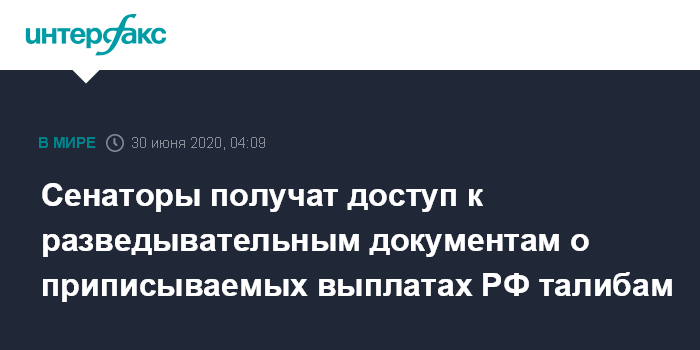 Москва. 30 июня. INTERFAX.RU - Сенаторы получат доступ к разведывательным документам, связанным с сообщением о приписываемой причастности России к нападениям талибов (движение "Талибан", запрещенная в РФ террористическая организация - ИФ) на американских военнослужащих в Афганистане, сообщает The Hill.