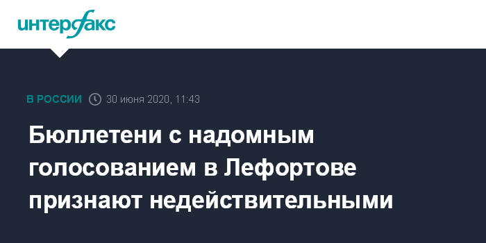 Москва. 30 июня. INTERFAX.RU - В Лефортове признаны недействительными бюллетени в сейф-пакете с результатами надомного голосования на участке №1403, объявил зампред Мосгоризбиркома Дмитрий Реут. По его словам, избиратель 29 июня пожаловался, что, придя на участок, обнаружил пометки в журнале, что он и его жена уже проголосовали на дому.