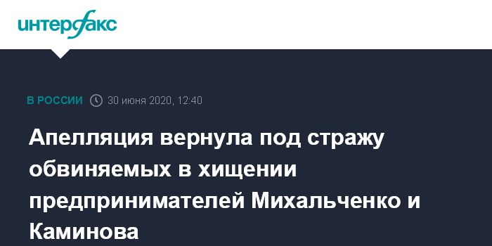 "Постановление об изменении меры пресечения Дмитрию Михальченко и Андрею Каминову отменено. Мера пресечения в виде содержания под стражей продлена до сентября", - сообщили "Интерфаксу" в суде.