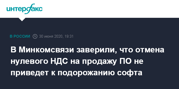 Москва. 30 июня. INTERFAX.RU - Отмена нулевой ставки НДС на продажу ПО, которую Минкомсвязи РФ предлагает ввести с 2021 года для компенсации потерь бюджета из-за льгот для IT-отрасли, не вызовет роста конечной цены на софт, считает министр связи Максут Шадаев.