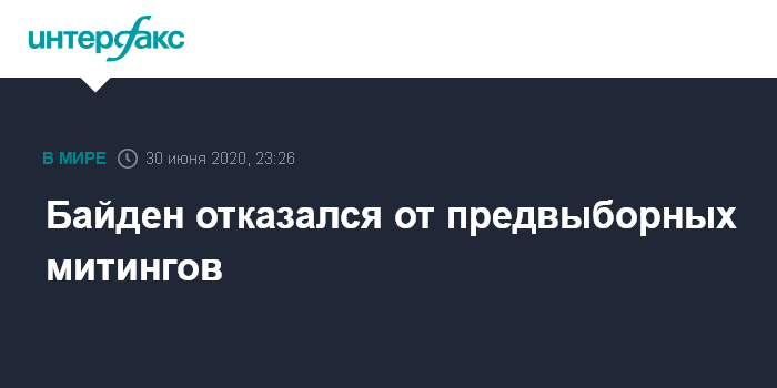 Москва. 30 июня. INTERFAX.RU - Вероятный кандидат в президенты США от демократов Джо Байден объявил, что до самых выборов в ноябре 2020 года не собирается проводить предвыборные митинги, чтобы защитить себя и избирателей от коронавируса.