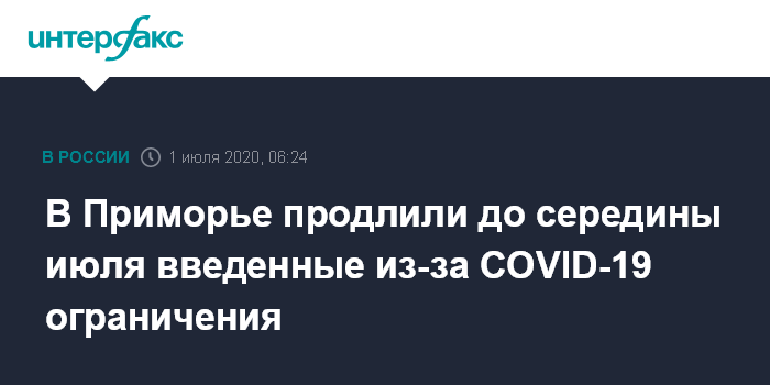 Москва. 1 июля. INTERFAX.RU - Режим повышенной готовности, введенный ранее в Приморье для борьбы с распространением коронавируса, продлен на две недели, до 15 июля, соответствующее постановление губернатора Приморья Олега Кожемяко размещено на сайте правительства края.