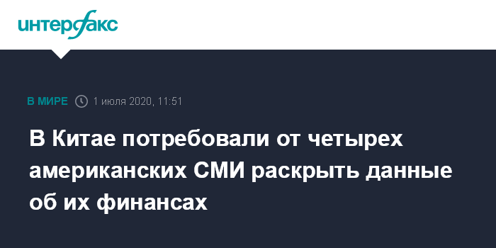 Москва. 1 июля. INTERFAX.RU - Власти КНР в среду отдали распоряжение четырем американским СМИ в течение семи дней обнародовать данные об их финансовых операциях на территории Китая и их сотрудниках, сообщают западные СМИ.