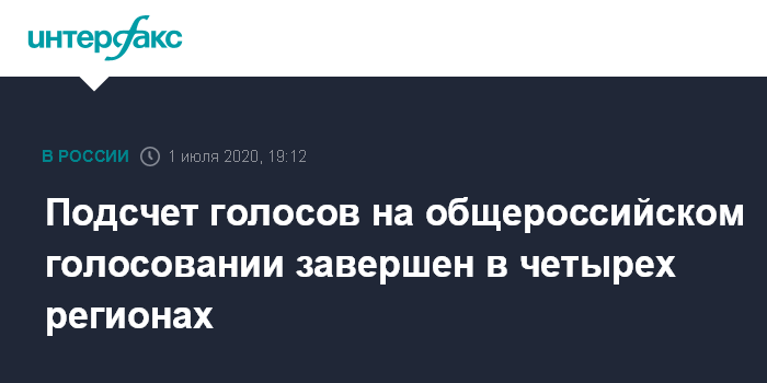 Москва. 1 июля. INTERFAX.RU - Подсчет голосов на плебисците по поправкам в Конституцию России завершен в Еврейской автономной области, Сахалинской области, Камчатском крае и Чукотском автономном округе, свидетельствуют данные ЦИК РФ.