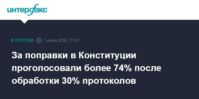 "На Дальнем Востоке и Сибири голосование завершилось несколько часов назад. По результатам обработки более 30% (от всех) протоколов УИКов, (за поправки - ИФ) чуть более 74%, против - 25%", - сказала Памфилова в информцентре ЦИК в среду.