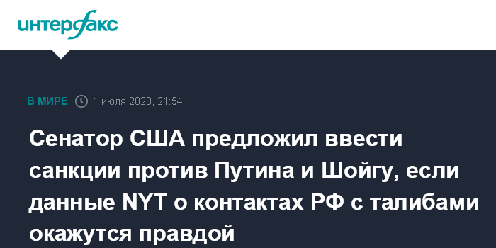 Сенатор США предложил ввести санкции против Путина и Шойгу, если данные NYT о контактах РФ с талибами окажутся правдой