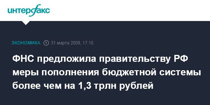 Москва. 31 марта. INTERFAX.RU - Федеральная налоговая служба (ФНС) 23 марта направила в правительство письмо о мерах налогового администрирования, которые могут дать дополнительные доходы федеральному бюджету в объеме свыше 900 млрд рублей и субъектам РФ - около 400 млрд рублей. Текст письма имеется в распоряжении агентства "Интерфакс-АФИ".