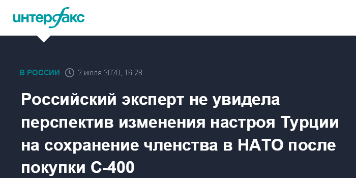 Москва. 2 июля. INTERFAX.RU - Турция продолжит держать курс на сохранение членства в НАТО, это является приоритетом для Анкары даже после покупки С-400 у РФ, заявила руководитель Центра ближневосточных исследований ИМЭМО им. Е.М.Примакова РАН Ирина Звягельская.