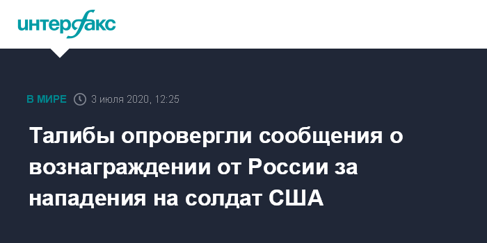 Москва. 3 июля. INTERFAX.RU - Афганские талибы (движение "Талибан" запрещено в России) опровергли сообщения о том, что они якобы получали какие-либо вознаграждения от России за нападения на американских солдат в Афганистане.