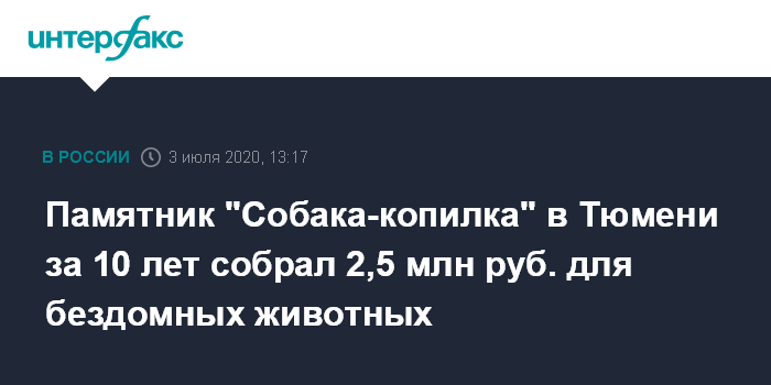 Москва. 3 июля. INTERFAX.RU - Почти 2,5 млн рублей пожертвований для собак и кошек удалось собрать благодаря памятнику-копилке, установленному в Тюмени в 2010 году. Об этом сообщила агентству "Интерфакс" директор благотворительного фонда помощи бездомным животным "Потеряшки" Ольга Гулецкая.