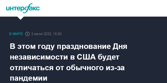 Москва. 3 июля. INTERFAX.RU - В этом году празднования 4 июля, когда в США отмечается День независимости, из-за пандемии коронавируса будут отличаться от привычных, многие традиционные мероприятия состоятся или будут транслироваться онлайн, сообщают американские СМИ.