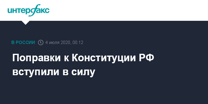 Москва. 4 июля. INTERFAX.RU - Поправки к Конституции Российской Федерации вступают в силу в субботу, 4 июля, говорится в тексте указа президента Владимира Путина, подписанного в минувшую пятницу.