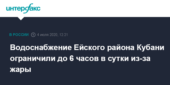 Москва. 4 июля. INTERFAX.RU - Жесткий график подачи воды ввели в Ейском районе Краснодарского края из-за сильной жары, сообщила в субботу компания "Кубаньводкомплекс".