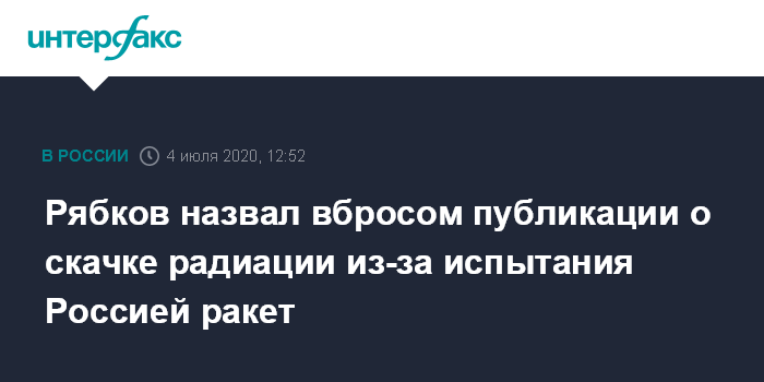 Москва. 4 июля. INTERFAX.RU - Публикации о том, что к повышению уровня радиации над Северной Европой могли привести испытания российского ядерного оружия, - это информационный вброс, заявил "Интерфаксу" в субботу замглавы МИД РФ Сергей Рябков.