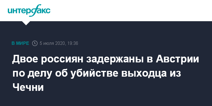 Москва. 5 июля. INTERFAX.RU - Австрийские следователи выясняют обстоятельства убийства 43-летнего выходца из Чечни, по этому делу задержаны двое граждан РФ, сообщают в воскресенье европейские СМИ.