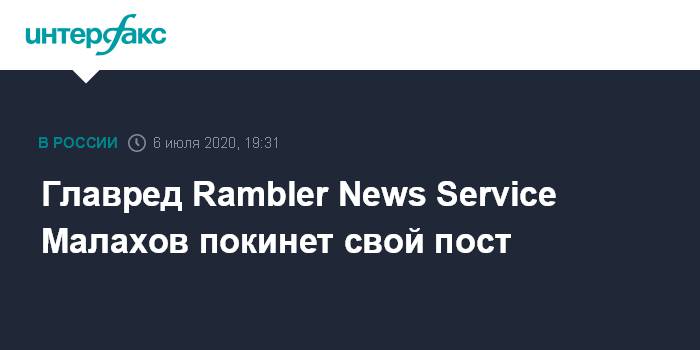 Москва. 6 июля. INTERFAX.RU - Главный редактор Rambler News Service (RNS) Александр Малахов покидает свой пост, сообщил "Интерфаксу" источник, знакомый с ситуацией, и подтвердили в Rambler Group.