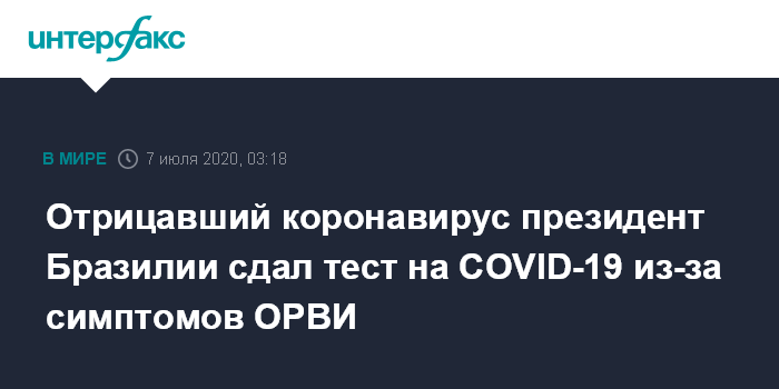 Москва. 7 июля. INTERFAX.RU - Президент Бразилии Жаир Болсонару тест на COVID-19 после того, как у него появились симптомы респираторного заболевания, сообщает O Globo.